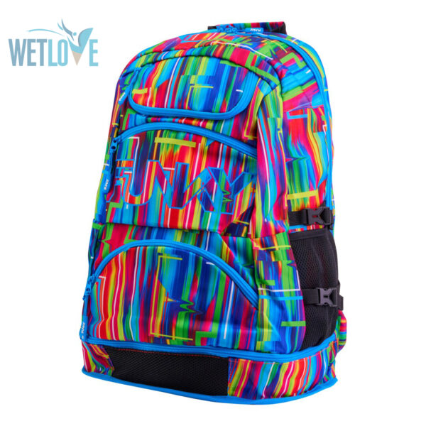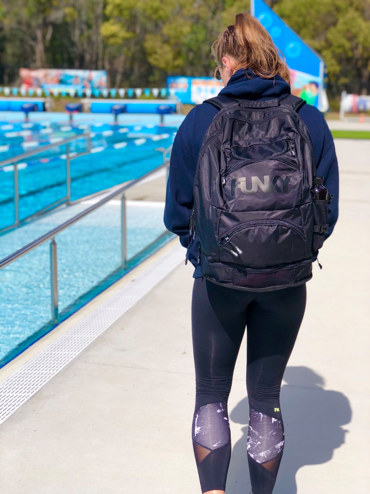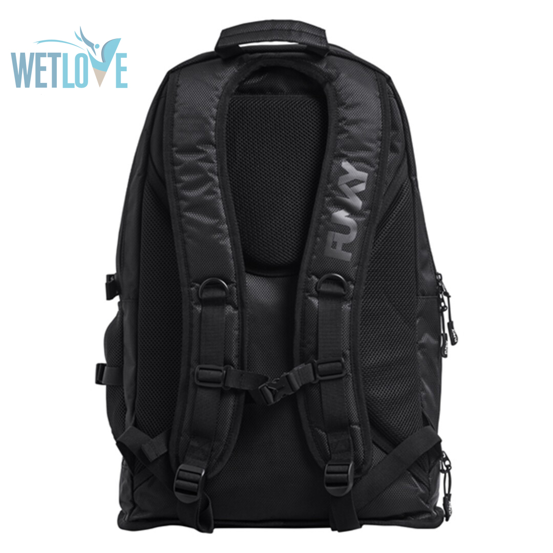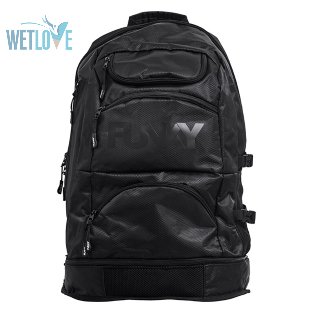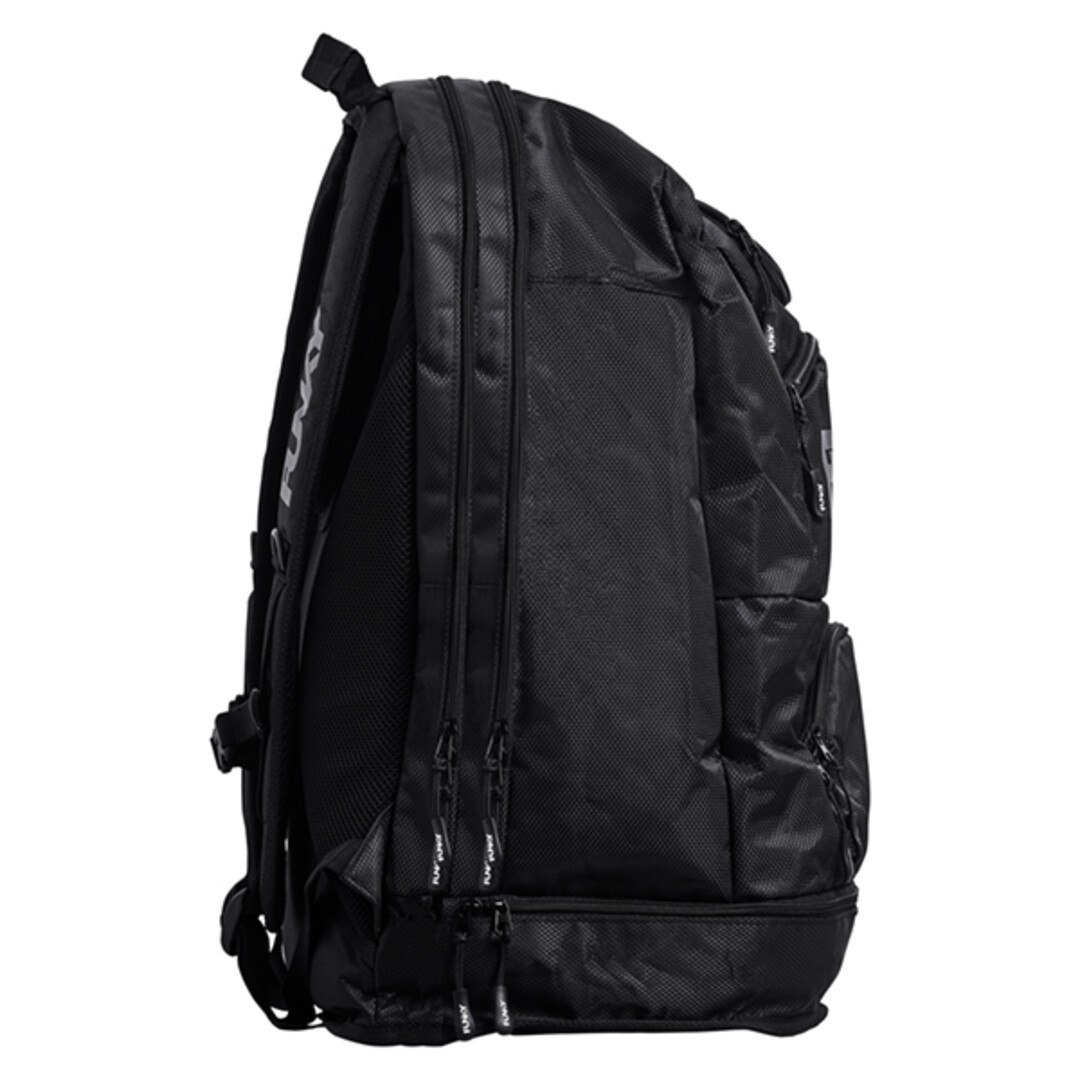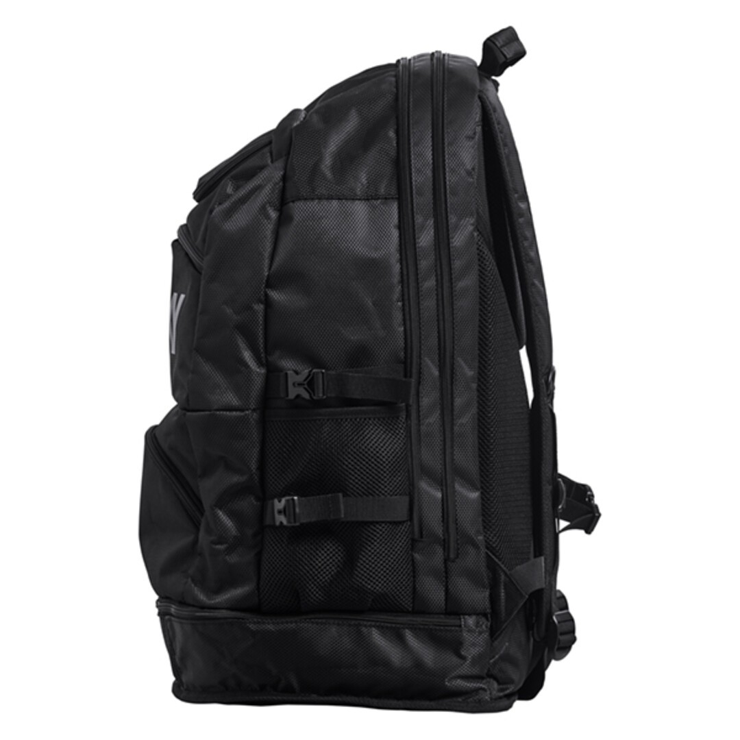 Mochila de 36 litros de capacidad con múltiples compartimentos, incluyendo un compartimento forrado en tela para gafas, un compartimento inferior impermeable para calzado y toallas mojadas.